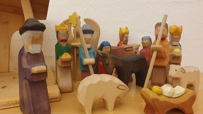 Vi finder julekrybben frem, hører fortællingen om dengang Jesus blev født og hjælper hinanden med at sætte dem alle sammen frem: Maria, Josef, Jesus-barnet, engle, hyrder og får, samlet i stalden.